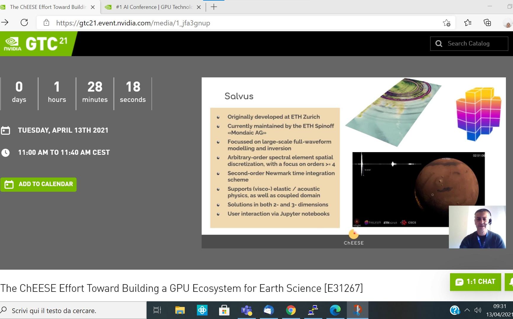 ChEESE researchers Piero Lanucara (CINECA) and Josep de la Puente (BSC) presented the talk "The ChEESE Effort Toward Building a GPU Ecosystem for Earth Science" at the GPU Technology Conference 2021 (GTC 2021) on 13 April 2021 at 11:00-11:40 CEST.