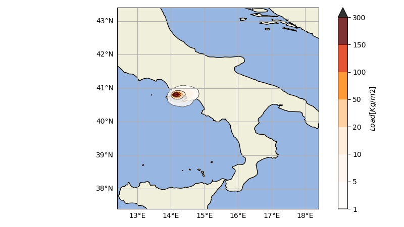 The short-term PVHA is proposed as an illustrative example at the Campi Flegrei volcano, on a particular set of dates (5 to 7 December 2019), when an earthquake of magnitude 3.1 was located in the caldera. The long-term hazard assessment is proposed both for Campi Flegrei (for ground tephra accumulation and airborne ash concentration), and Jan Mayen island (for the airborne ash concentration only). |