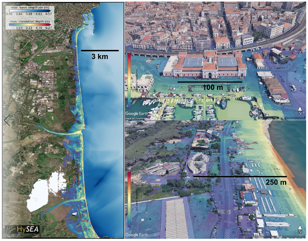 Test case conducted for the tsunami hazard in Catania using a total of 32363 earthquake scenarios, using a system of nested grids with 10m-spacing at the finest resolution. A complete Tsunami-HySEA tsunami simulation for Catania with the grid system presented here took approximately 25 minutes on the MARCONI-100 supercomputer at CINECA, meaning that approximately 13600 GPU hours are required to complete the set of scenarios selected. With 1024 simulations able to run in parallel, around 14 hours of clock-time are needed to perform these calculations. |